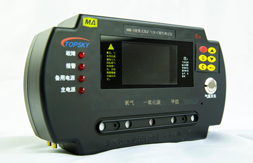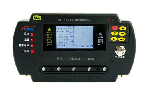 BMK-A便攜式煤礦氣體可爆性測定儀(以下簡稱測爆儀),是用于煤礦井下使用的礦用本安兼隔爆型攜帶式儀器。測爆儀用于煤礦井下,由礦山救護隊員攜帶進入災(zāi)區(qū),監(jiān)視作業(yè)環(huán)境周圍氣體組份是否存在爆炸危險。也可由消火人員攜帶,在處理自然發(fā)火或啟封火區(qū)過程中,檢測周圍環(huán)境或密閉內(nèi)空氣中甲烷、氧的濃度值,在儀器液晶顯示屏上直接顯示出O2、CH4、CO的濃度值和環(huán)境溫度值,并顯示出“爆炸三角形”的圖形及各氣體組份所構(gòu)成的坐標(biāo)點,臨近或達到警界限時儀器同時發(fā)出聲、光警報。