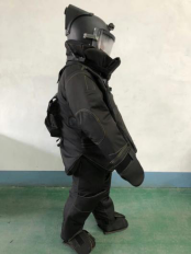 整套排爆服由褲子、帶有袖子和領(lǐng)子的上衣、三部分防爆板(頸部、腹部和腹股溝)、護手、護靴、配有防護面罩的頭盔、水冷服、通訊系統(tǒng)組成。