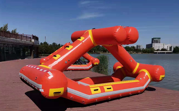 2. ★高處救援:2名成年人站在自扶正激流救生艇頂部,未見頂部氣柱明顯變形和傾倒。